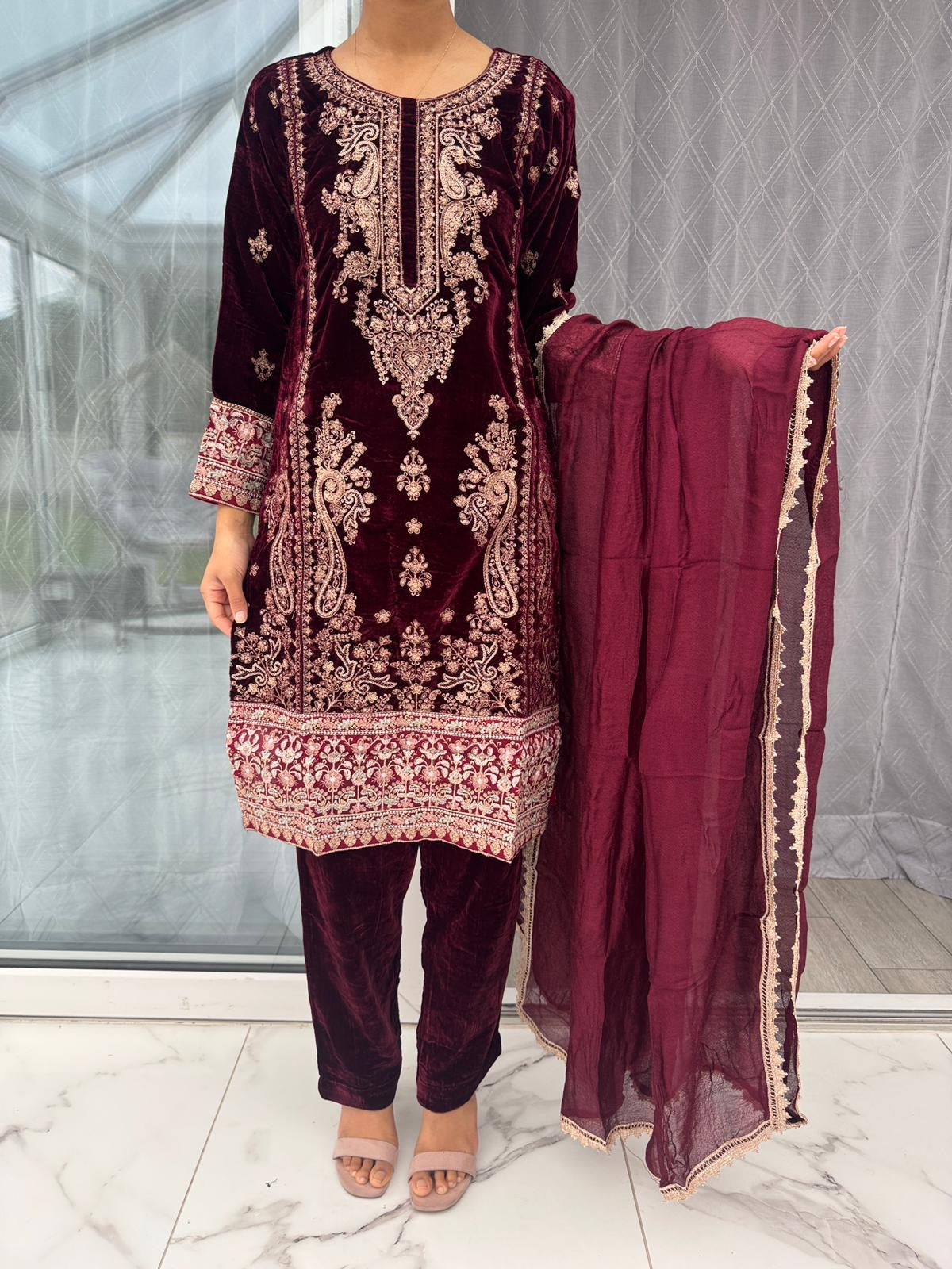 • Zari embroidered velvet kameez with sequins