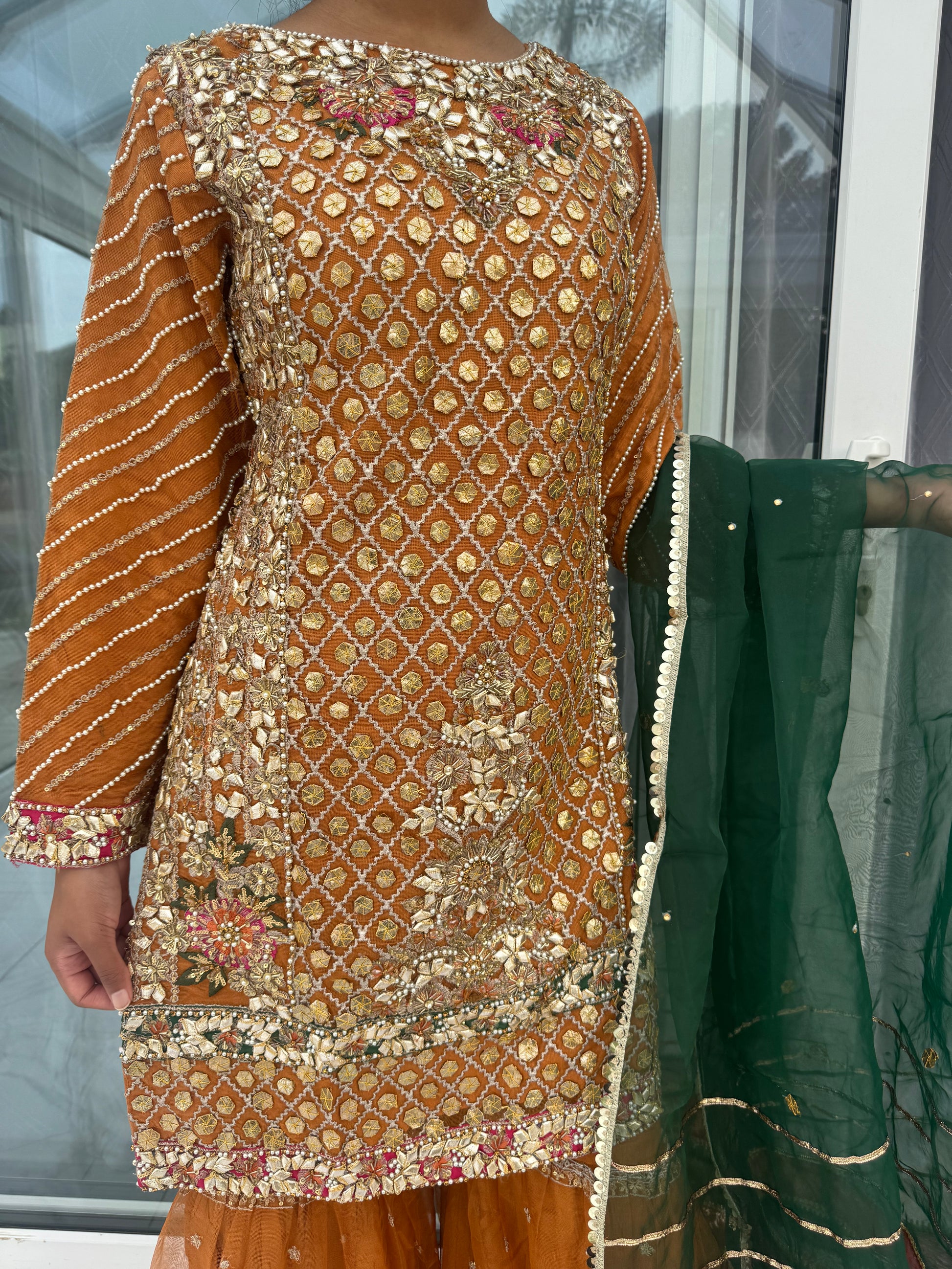 • Intricately embroidered net kameez with pearls and handwork
