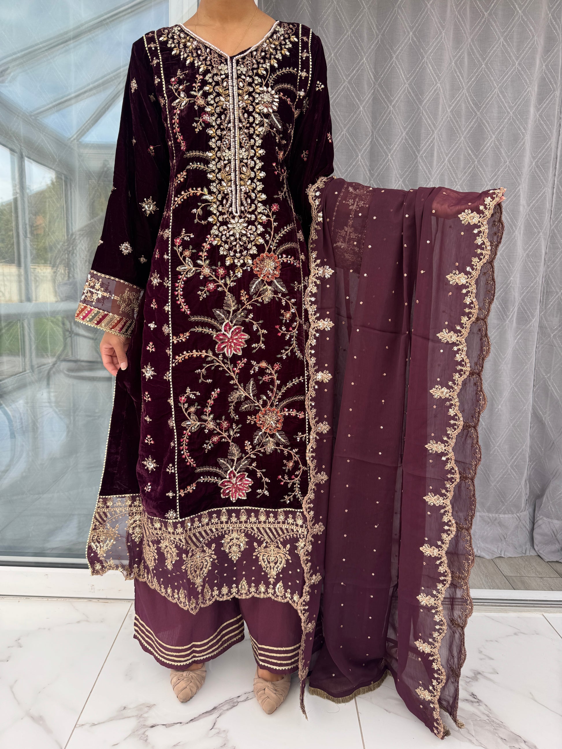 • Front and back intricately embroidered velvet kameez with sequins, handwork and pearl detailing