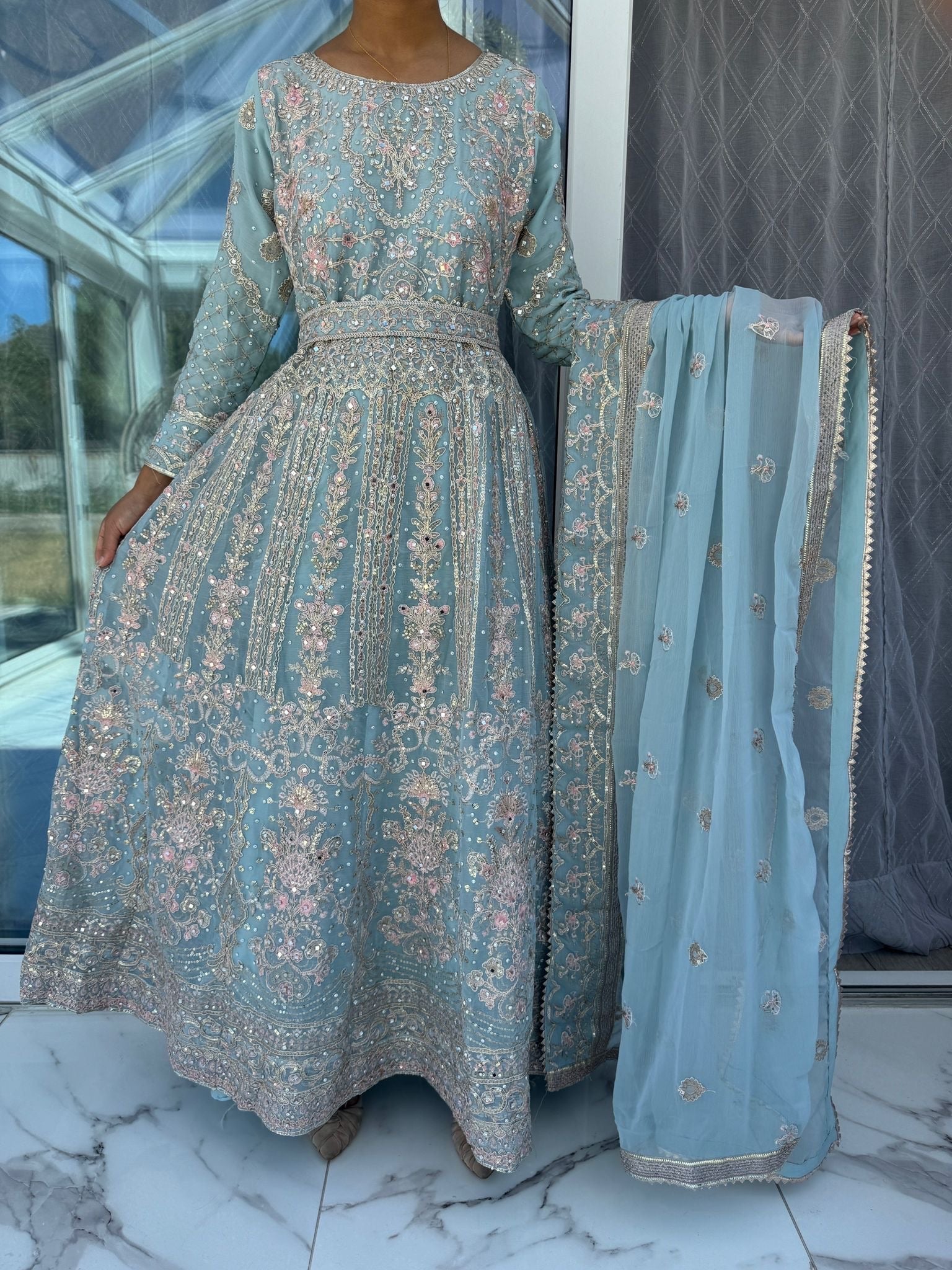 • Intricately front and back embroidered chiffon dress with sequins, gems and mirrors